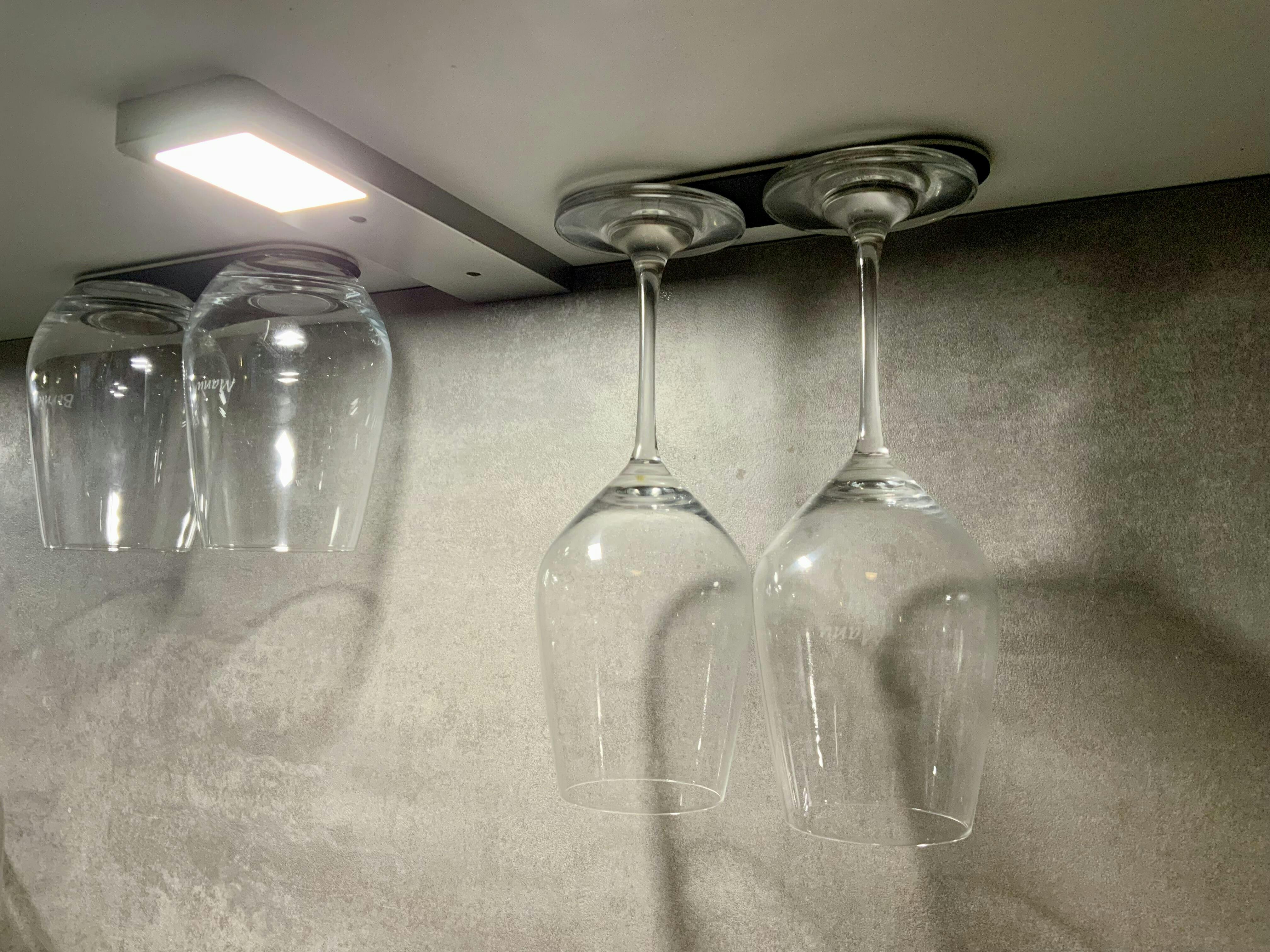 Durch den dicken Metall-Kern im Inneren der Leiste ist die Zugkraft stark genug, um die Gläser auch während der Fahrt kopfüber hängen zu lassen.