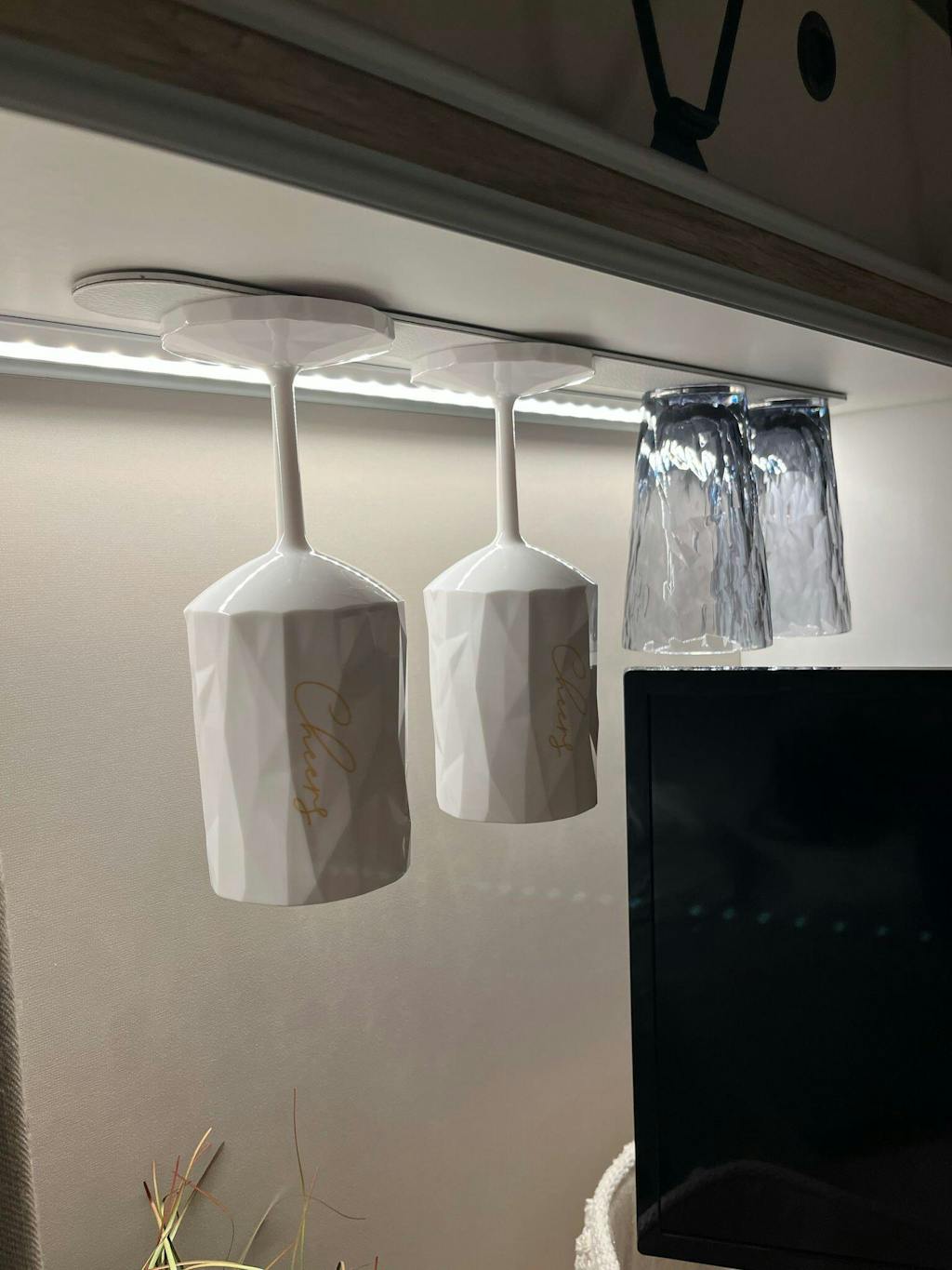 Durch den dicken Metall-Kern im Inneren der Leiste ist die Zugkraft stark genug, um die Gläser auch während der Fahrt kopfüber hängen zu lassen.